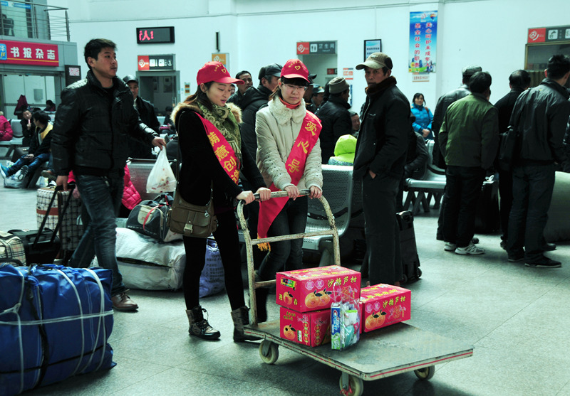 來自揚(yáng)汽集團(tuán)和團(tuán)市委組織的志愿者們有的在進(jìn)站口向旅客指引車站售票、候車等各個(gè)功能區(qū)位置;有的在服務(wù)臺(tái)回答旅客咨詢;有的在安檢處勸導(dǎo)旅客把攜帶的物品放上危險(xiǎn)品檢查儀安檢;有的推著“雷鋒車”幫行李較多的旅客拖運(yùn)箱包;有的給候車的旅客倒上一杯熱水;有的在檢票口幫助維持現(xiàn)場秩序,避免發(fā)生擁堵;還有的在候車大廳勸導(dǎo)旅客請勿吸煙……